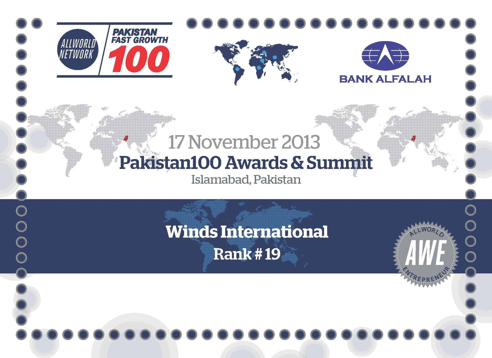 Alhamdulillah, Winds International proudly announces another significant achievement: ranking 19 out of 100 fast growth companies at the Pakistan Top 100 Fast Growth Companies Awards – 2013 held at Serena Hotel Islamabad